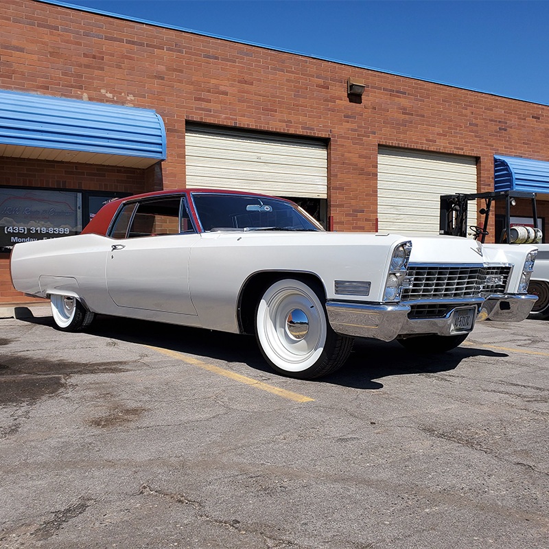 Glistening in white with a rich burgundy top, this '67 Cadillac showcases classic elegance on white wheels