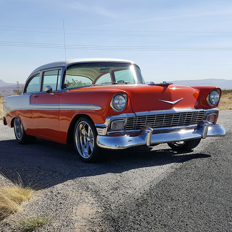 A stunning '56 Belair in vibrant orange and crisp white, aptly named "Dreamsicle." Truly a delightful blend of nostalgia and style.